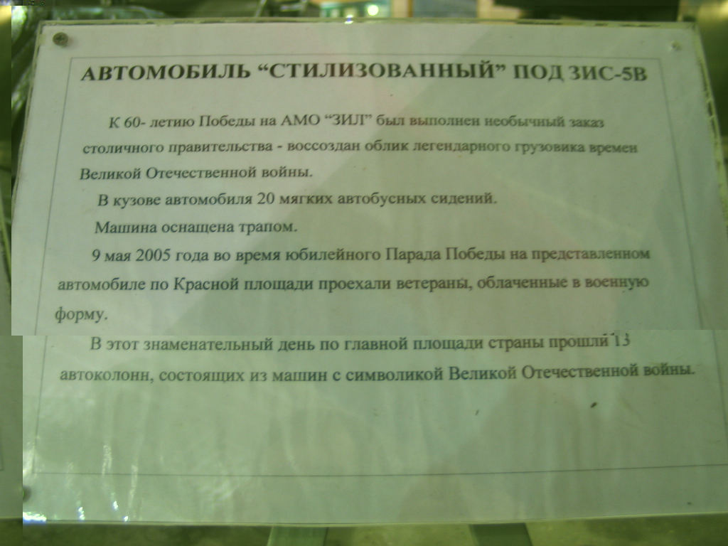 Если у кого есть фотки старых моделей ЗиС и ЗиЛ вывешивайте.Этот автомобиль - не старый автомобиль. Это реплика ЗИС-5, партия таких грузовиков была построена к 50-летия Победы. В основе лежит стандартный ЗИЛ-433362. После Парада всё бутафорское оперение демонтировали, и на конвейере ЗИЛа установили стандартные кабину и оперение. А в таком виде сохранились только 2 экземпляра: один на ЗИЛе, другой в Рязанском музее автомобильной техники.