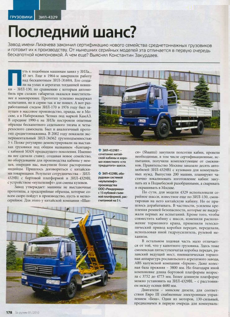 В первом номере 2010 года журнала "За рулём" опубликована статья про новинку ЗИЛ 4329. От заголовка статьи и её окончания повеяло ироническим настроением про "последний шанс". Пересекаясь по работе с Российскими автозаводами-у них всех он последний. В непростом 2009 году именно АМО ЗИЛ порадовал своей ровной работой, в отличии от других заводов. Да, были проблемы с филиалами (хотя они остаются и по сей день)- они решаются, может и не так быстро как хотелось бы. Надеюсь новая модель пойдет в производство.
