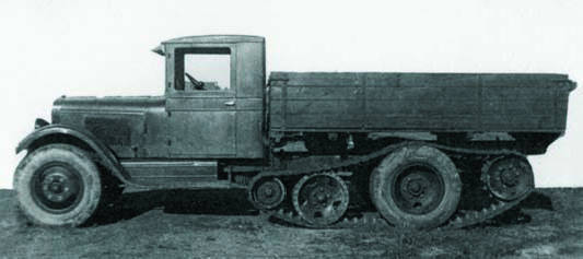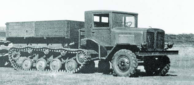 Более продуктивной оказалась работа над полугусеничными грузовиками. В 1938 г. первым в этом ряду был ЗИС-22 на 73-сильном шасси ЗИС-5, ставший развитием машины НАТИ-ВЗ (вездеход ЗИС), разработанной коллективом НАТИ под руководством Г. А. Сонкина. Автомобиль был снабжен движителями с резинометаллическими лентами, передними и задними фрикционными ведущими катками с цепным приводом. До середины 1940 г. построили около 200 грузовиков ЗИС-22, но их эксплуатация доказала сложность и ненадежность этой конструкции. Примером второго направления развития полугусеничной техники стала машина ЗИС-33, представлявшая собой грузовик ЗИС-5 с упрощенными гусеничными движителями с бортовыми цепными передачами на задние ведущие звездочки непосредственно от колес автомобиля. В начале 1940 г. их собрали 3,7 тыс. экземпляров, а затем к производству был принят вариант ЗИС-35 с дополнительным задним мостом с ведущими звездочками. Эти вездеходы военных также не удовлетворяли. Эскалация Второй мировой войны активизировала работы по созданию более надежных полугусеничных бортовых машин. Новый движитель состоял из двух более узких гусеничных "полулент", соединенных поперечными накладками, что позволило использовать передние ведущие зубчатые колеса с цепным приводом, исключавшие пробуксовку и соскакивание гусениц. Осенью 1940 г. он был смонтирован на вездеходе НАТИ-52, которому соответствовал опытный образец ЗИС-22-52. В июле 1941 г. испытания прошел доработанный грузовик ЗИС-22М, но развернуть его производство уже не успели. Только летом 1942 г. начался выпуск модернизированного варианта ЗИС-42. Это был грузовик с полезной нагрузкой 2,25 т, двигателем мощностью 73–85 л.с., бортовым кузовом с тентом, расширенными с 390 до 415 мм гусеничными лентами, щитком между передними концами рамы, кожухом под передним мостом, тремя топливными баками емкостью 295 л и съемными лыжами на передних колесах. На шоссе машина развивала скорость 42 км/ч, на бездорожье — до 20 км/ч, расходуя от 58 до 95 л на 100 км. С 1944 г. выпускался усиленный грузовик-тягач ЗИС-42М с мотором мощностью 76–85 л.с. и защитной решеткой радиатора и фар. До 1946 г. было выпущено 6372 машины серии ЗИС-42. В 1941–42 гг. горьковский артиллерийский Завод № 92 имени Сталина (ЗИС) на шасси серии "22/42" собрал опытные образцы самоходных установок ЗИС-41 и ЗИС-43 с пушками калибра 57 и 37 мм соответственно.