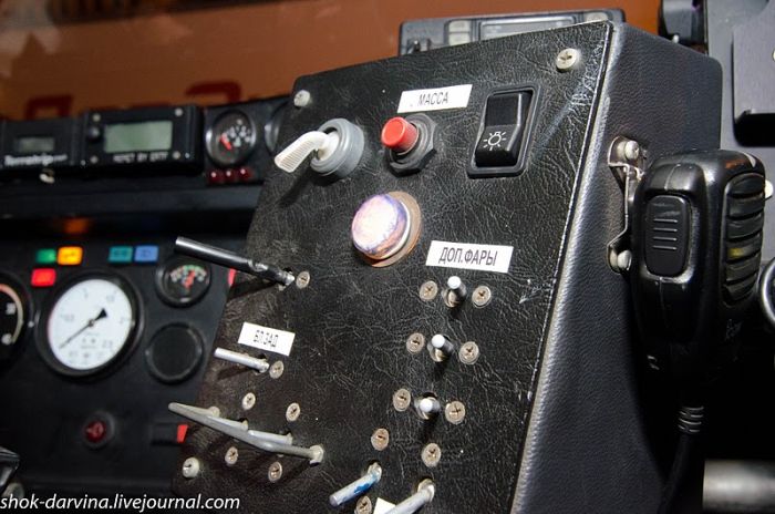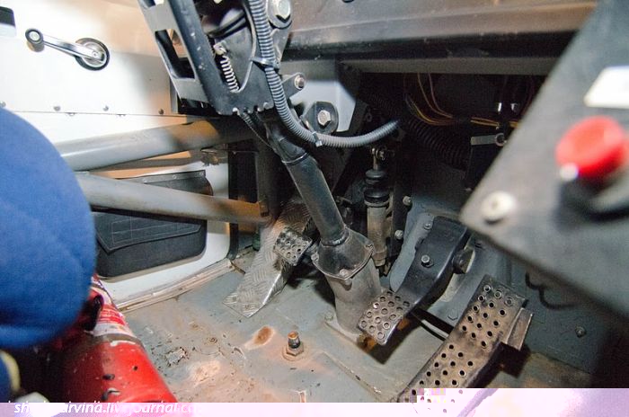 Интерьер кабины назвать даже спартанским совершенно невозможно: двери без внутренней обивки, внутри — ничем не прикрытые жгуты проводов и голый металл... А еще тут полным-полно всевозможных приборов и тумблеров, от количества которых глаза лезут на лоб! Признаюсь, даже имея высшее техническое образование и некоторый «накат» на спортивных автомобилях, мне удалось разобрать назначение только половины рычажков и дисплеев