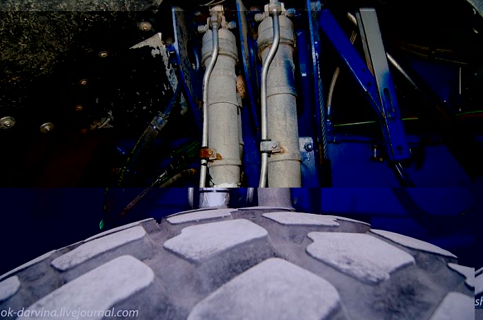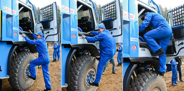 На этих фотографиях — гоночный «КАМАЗ» текущего года постройки. От своего предшественника новый грузовик отличается не только иным оформлением передка с маленькими ксеноновыми фарами, но и кабиной, сдвинутой назад на расстояние, максимально разрешенное правилами ралли-рейдов. И хотя залезать внутрь стало катастрофически неудобно, новая компоновка улучшила развесовку по мостам до классических «пятьдесят на пятьдесят»
