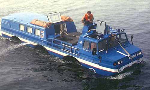 В названии детища столичного АМО ЗИЛ и Правдинского завода радиорелейной аппаратуры (ПЗРА) «Вездеход-ГВА» увековечено имя Грачева Виталия Андреевича – выдающегося отечественного инженера-новатора, основателя и первого руководителя особого отдела, занимавшегося созданием мобильной техники сверхвысокой проходимости. В 1992 году АМО ЗИЛ по экономическим соображениям отказался от производства ряда моделей, использующихся в оборонном и космическом комплексах страны, а их изготовление было возложено на «Вездеход-ГВА», ставшего самостоятельным предприятием. Компоновка амфибий ЗИЛ-4906 и 49061 выполнена следующим образом. В носовой части сосредоточены радионавигационный комплекс и 4-местная кабина экипажа. Сразу за передней осью смонтирован силовой агрегат с обслуживающими системами, все остальное пространство отведено грузовому отсеку. Равномерное расположение осей по базе машин (2400+ 2400 мм) дает возможность преодолевать канавы и рвы шириной более 1,5 м, вертикальные грунтовые и снежные уступы до 1 м.Используется V-образный 8-цилиндровый бензиновый двигатель ЗИЛ-508.10 мощностью 150 л.с., либо его дизельный 136-сильный вариант ЗИЛ-0550.30. Пятиступенчатая механическая коробка передач и 2-ступенчатая раздаточная коробка обеспечивают 10 передач переднего и две - заднего хода. Трансмиссия выполнена по так называемой схеме с бортовой раздачей потока мощности. Это означает, что усилие передается к колесам каждого борта, которые имеют жесткую кинематическую связь между собой. При этом межбортовой дифференциал снабжен механизмом блокировки. Помимо высокой тяги, развиваемой в наиболее сложных условиях, подобное техническое решение позволяет понизить центр тяжести груза и всего вездехода.Водоизмещающий корпус с удачными гидродинамическими обводами, кабина, пол кузова у ЗИЛ-4906 отформованы из стеклопластика. В стандартную комплектацию входят водооткачивающая система, автоматическая установка пожаротушения, система кондиционирования воздуха, генератор постоянного тока мощностью 4,5 кВт.