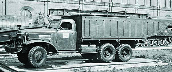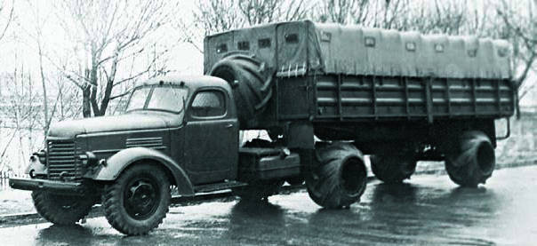 Главной новинкой послевоенного времени стал 4-тонный грузовик ЗИС-150 с 6-цилиндровым двигателем ЗИС-120 (5,55 л, 90 л.с.), 5-ступенчатой коробкой передач и пневматическим приводом тормозов. В Советской армии он применялся для доставки различных грузов и личного состава, в том числе первых авиадесантных подразделений, служил базой различных цистерн и специального оборудования. В 50-е гг. для военных нужд на его базе был создан седельный тягач ЗИС-120Н с задними арочными шинами, буксировавший бортовой полуприцеп с такими же колесами. Главной же ролью ЗИС-150 в развитии военной автотехники стало использование его шасси для перспективного поколения армейских машин повышенной проходимости. Еще в ноябре 1944 г. появился опытный образец ЗИС-150П (4x4), но военные его не приняли. К тому времени советские конструкторы уже хорошо были знакомы с поступавшими по ленд-лизу американскими грузовиками с колесной формулой 6x6, поэтому приоритет был отдан 3-осной машине. При этом, несмотря на явное преимущество опытного образца 2,5-тонного грузовика ЗИС-151 (6x6), построенного в 1946 г. и оснащенного всеми односкатными колесами с одинаковой колеей, под сильным влиянием американского авторитета предпочтение было отдано более грузоподъемному варианту с задней двускатной ошиновкой. Бортовой ЗИС-151, собиравшийся с октября 1948 г., получил 90-сильный двигатель от ЗИС-150, сухое 2-дисковое сцепление, 5-ступенчатую коробку с ускоряющей передачей и 2-ступенчатую раздаточную, два задних моста с индивидуальным приводом, состоявшим из 3 карданных валов и передний ведущий мост с шарнирами равных угловых скоростей "Бендикс-Вейсс" (Bendix-Weiss). В базовом исполнении он оснащался многоцелевым кузовом с решетчатыми бортами, продольными скамьями и тентом. ЗИС-151А получил переднюю 4,5-тонную лебедку, вариант "151Д" — экранированное электрооборудование. При общей схожести с американскими прототипами ЗИС-151, имевший полезную нагрузку по шоссе 4,5 т и снаряженную массу 5580 кг, был тяжелее, развивал скорость всего 55–60 км/ч и расходовал намного больше бензина — до 55 л на 100 км. Он преодолевал подъемы крутизной 28° и броды глубиной до 80 см. В 50-е гг. ЗИС-151 стал основным средним грузовиком в вооруженных силах СССР и социалистических стран. На его шасси выпускались топливо- и водомаслозаправщики АТЗ-3-151 и ВМЗ-151, устанавливалось различное специальное и инженерное оборудование, в том числе 15-тонный колейный механический мост КММ длиной 7 м и секции тяжелого понтонного парка ТПП, позволявшего строить временные мосты длиной более 200 м, выдерживавшие нагрузку до 70 т. 7 ноября 1957 г. седельные тягачи ЗИС-121Д впервые прошли на параде с зенитными ракетными комплексами С-25 "Беркут".